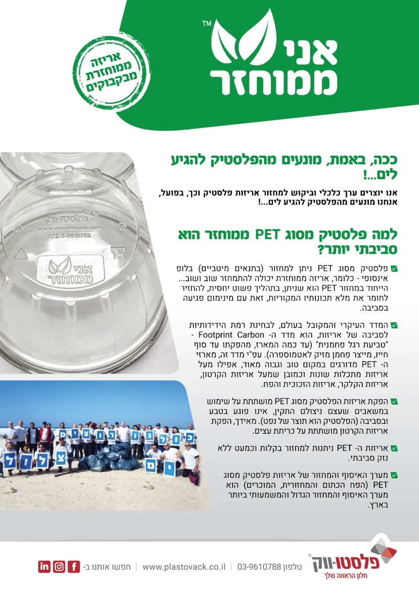 - אריזות ה -PET ניתנות למחזור בקלות וללא נזק סביבתי. לכן, עידוד המחזור והדגשת חשיבות העניין, ע”י כתיבת מספר דברים בנושא על מדבקת הלוגו שלכם, יכולה כמובן לעזור.